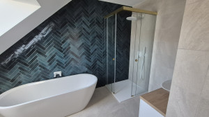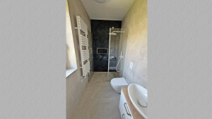 A fűtésről és melegvíz ellátásról hőszívattyú gondoskodik, padlófűtéssel.