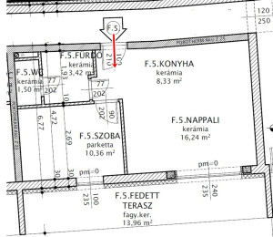 nappali 16,24 m2, konyha 8,33 m2 - szoba 10,36 m2 - fürdő 3,42 nm , wc 1,50 m2,