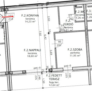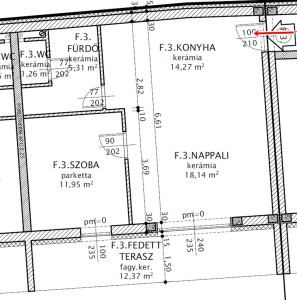 nappali 18,6 m2, konyha 14,23 m2 - szoba 11,95 m2 - fürdő 5,21 m2, wc 1,26 m2,