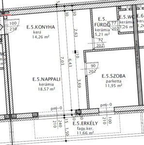 nappali 18,57 m2, konyha 14,26 m2 - szoba 11,95 m2 - fürdő 5,21 m2, wc 1,26 m2,