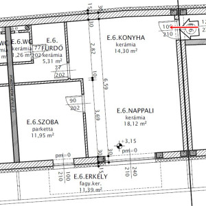 nappali 18,12 m2, konyha 14,3 m2 - szoba 11,95 m2 - fürdő 5,31 m2, wc 1,26 m2,